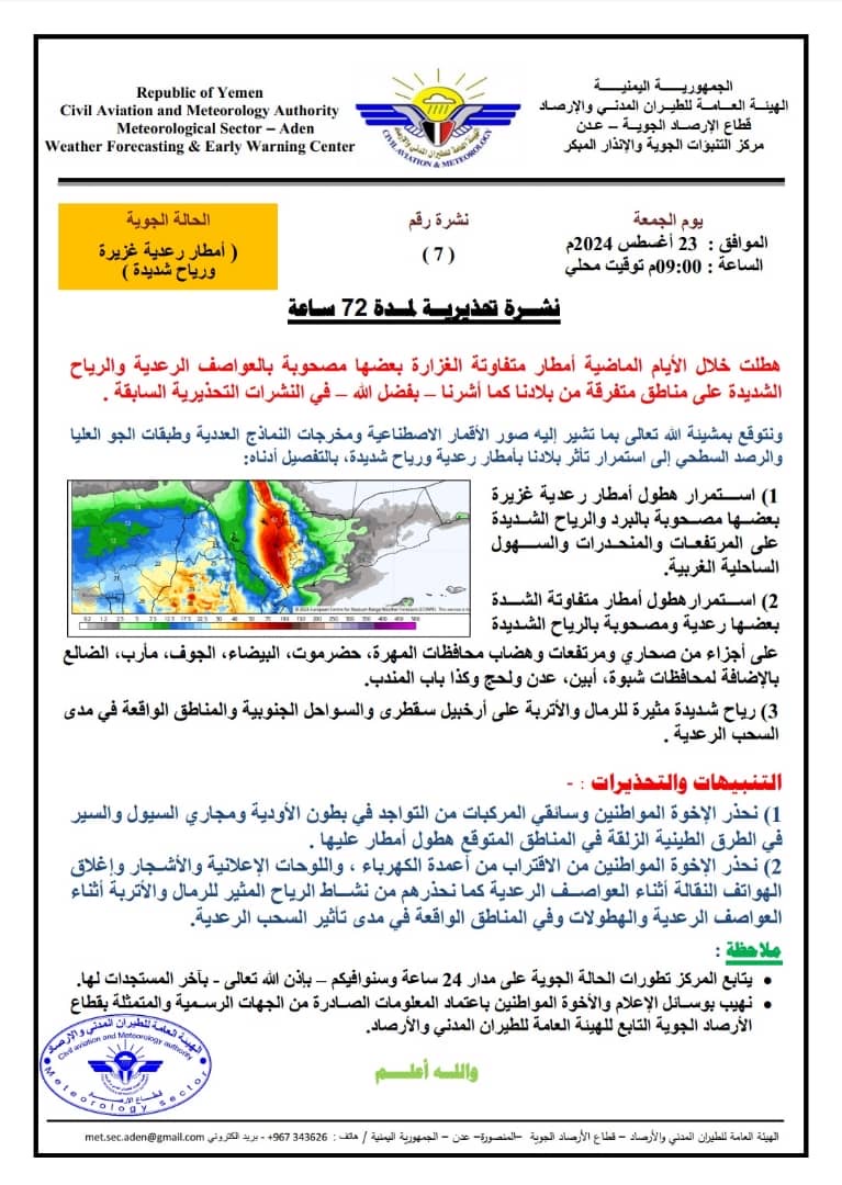 2) استمرار هطول أمطار متفاوتة الشدة بعضها رعدية ومصحوبة بالرياح الشديدة على أجزاء من صحاري ومرتفعات وهضاب محافظات المهرة، حضرموت، البيضاء، الجوف، مأرب، الضالع بالإضافة لمحافظات شبوة، أبين، عدن ولحج وكذا باب المندب.