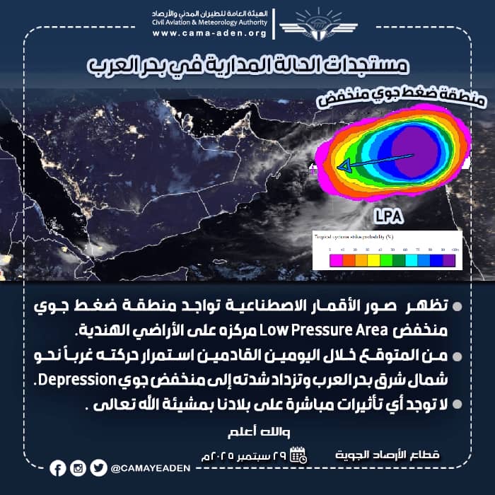 أعلن مركز التنبؤات الجوية والإنذار المبكر التابع للهيئة العامة للطيران المدني والأرصاد، في نشرة جوية صادرة مساء اليوم الإثنين 29/9/2025، بشأن مستجدات الحالة المدارية في بحر العرب، عن تواجد منطقة ضغط جوي منخفض Low Pressure Area، مركزه على الأراضي الهندية، بحسب ما أظهرته صور الأقمار الاصطناعية.